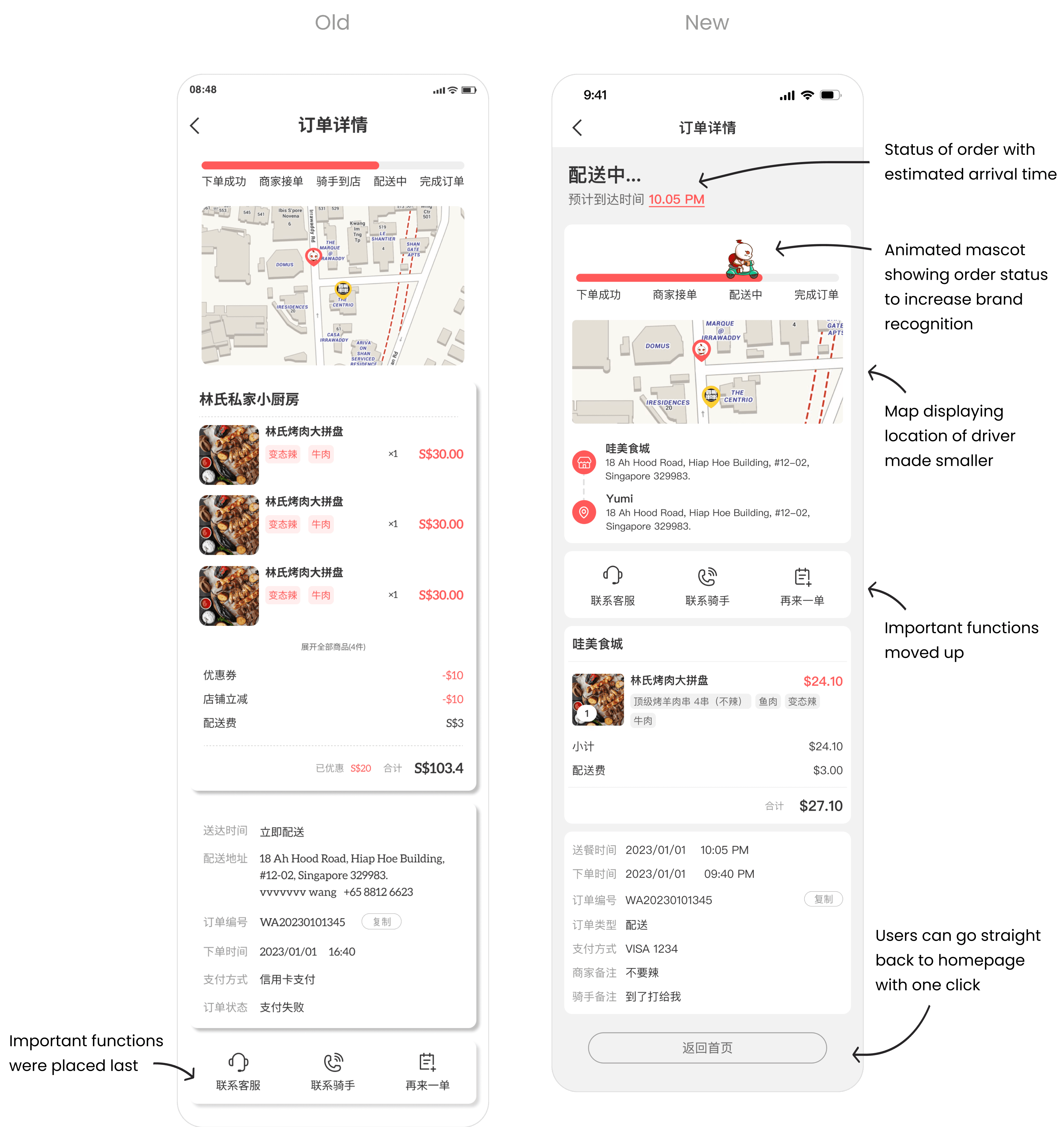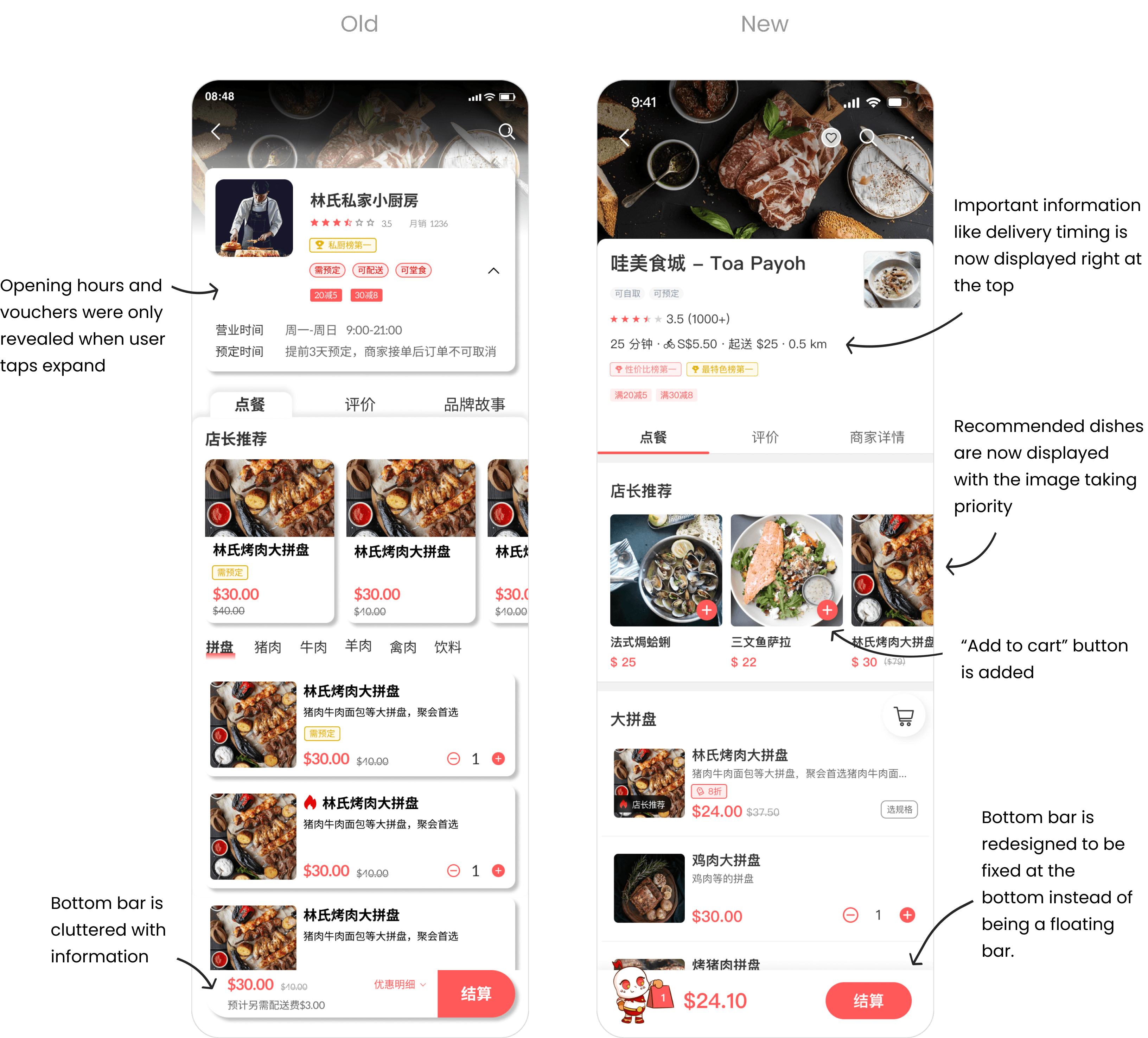 The old design is cluttered with information and has poor visual hierarchy. Key information like the delivery timing, delivery fees and minimum order fee are now displayed upfront. Whilst other unimportant information are moved to under ‘商家详情(Store’s detail)’ page.