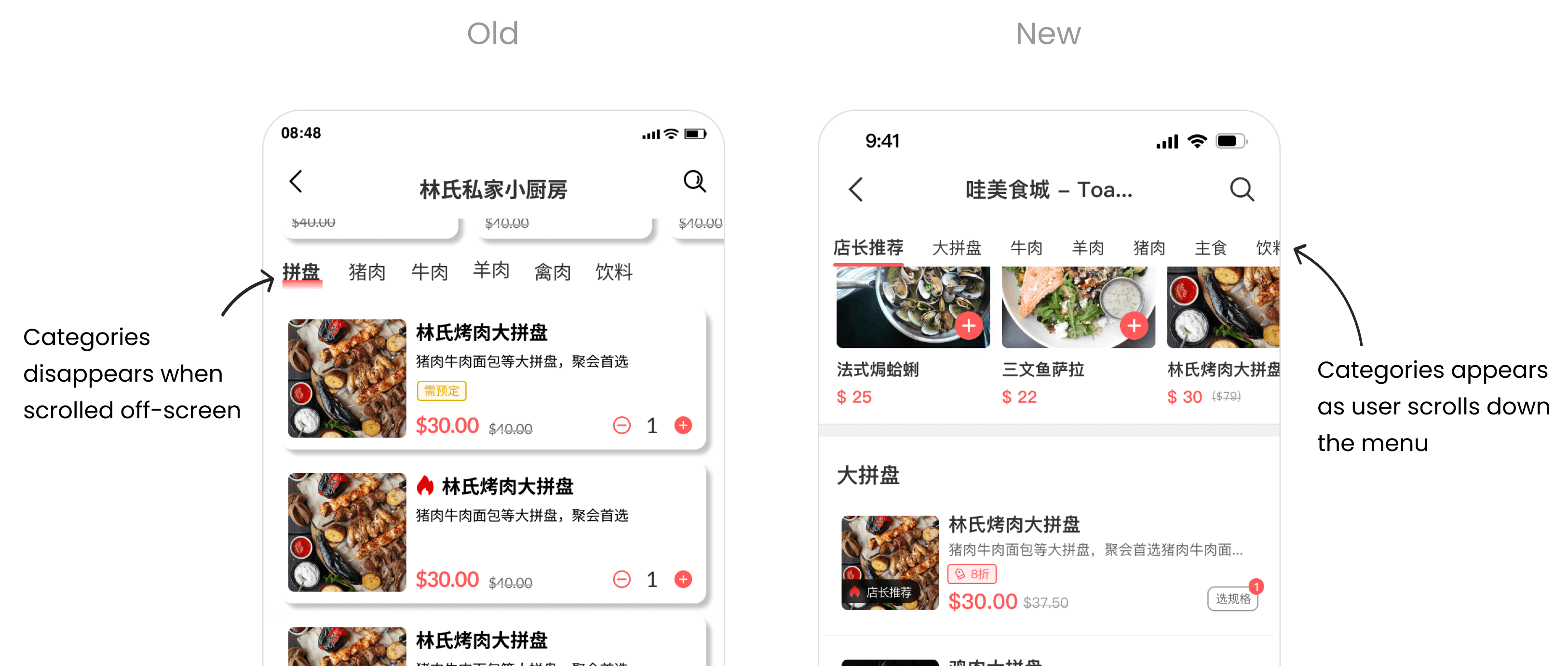 In the previous design, the menu categories disappeared off-screen once users scrolled past them, making it inconvenient for users to access them again. To address this, we implemented a header bar that appears with the menu categories as users scroll down the menu, allowing for easy navigation through food categories without the need to scroll back.